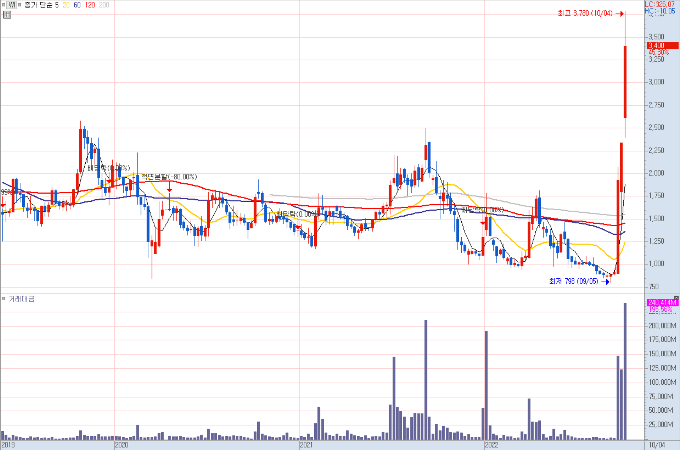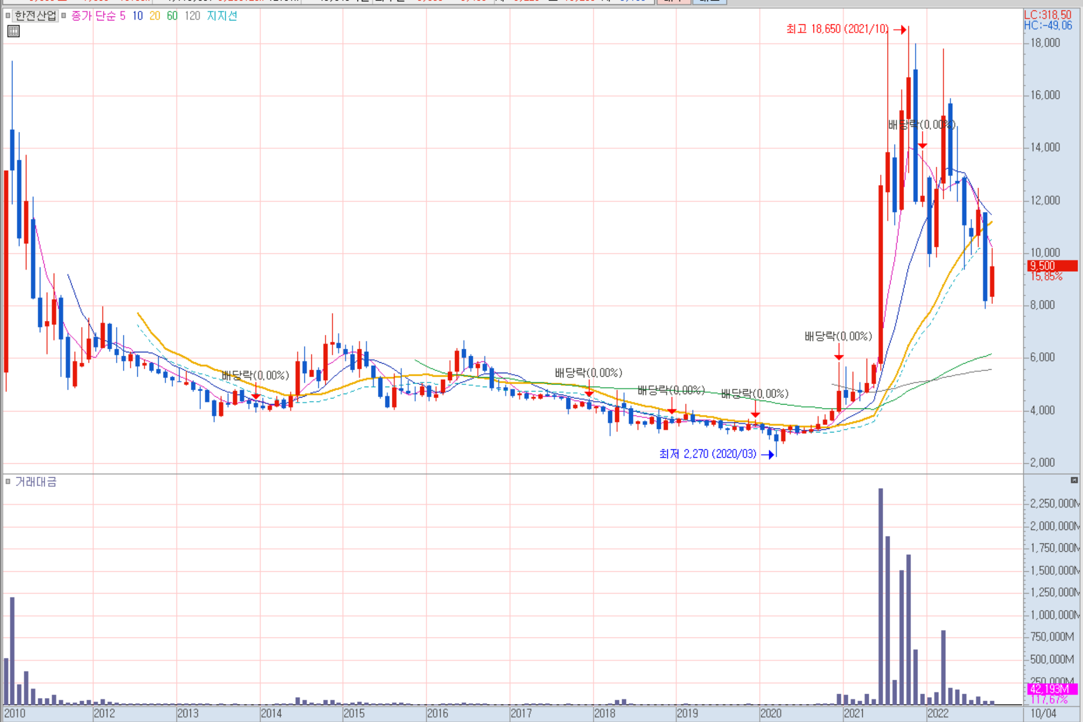 무림SP 월봉 차트 한전산업(130660) / +15.85% / 전력, 원전 /시가총액 3,097억 / 거래대금 403억