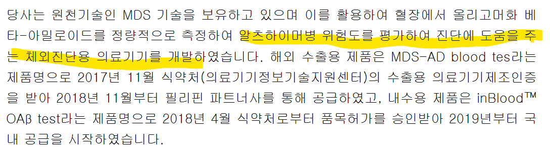 ->특히 주력 제품은 대표적인 퇴행성 뇌질환 중 하나인 알츠하이머병 조기진단에 활용할 수 있는 혈액 검사 제품이 있다. 이에 관련주로 꼽히며 부각되는 모양새