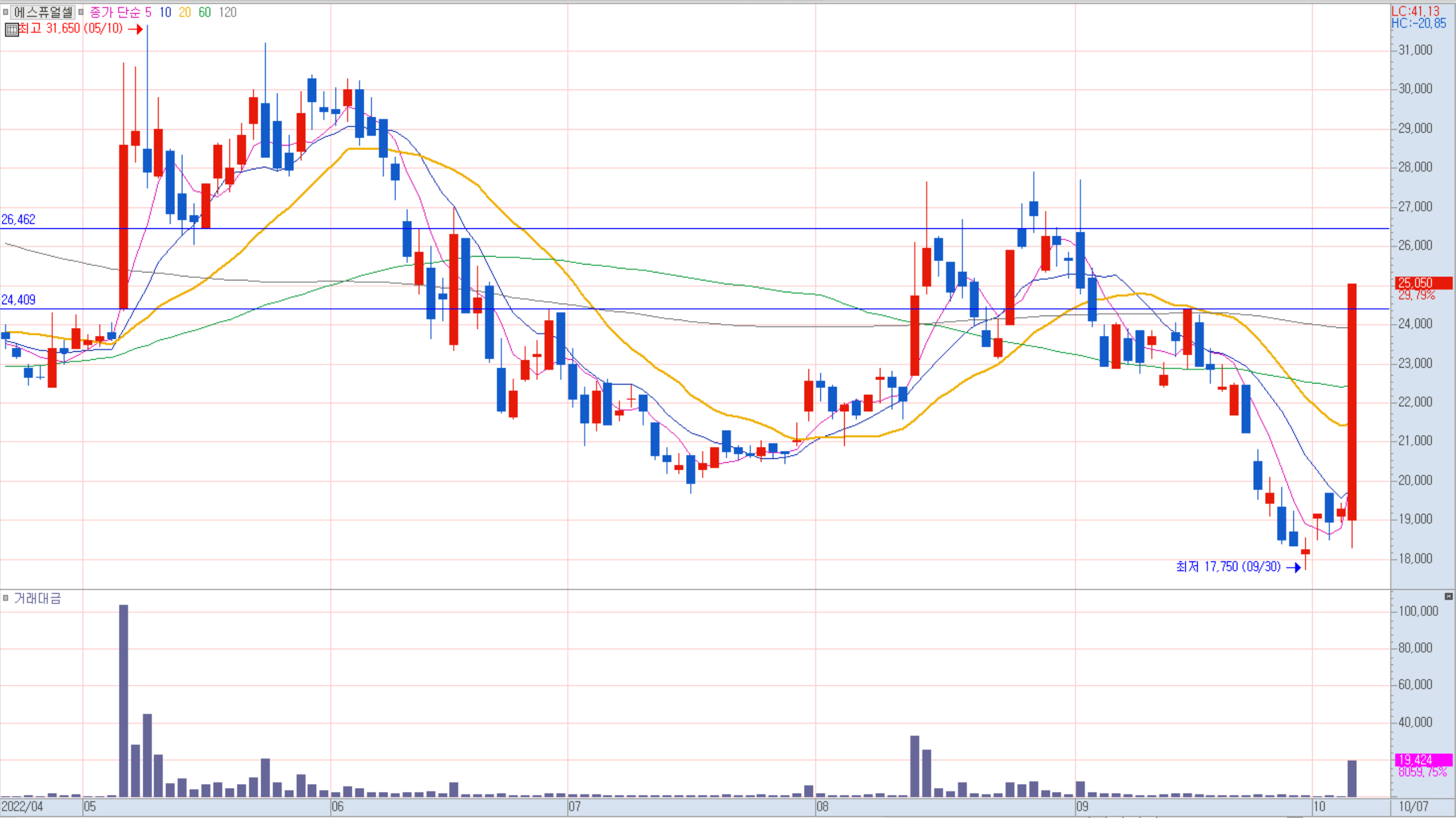 에스퓨얼셀 일봉 차트 양지사(030960) / +29.78% / 문구, 품절주/시가총액 8,182억 / 거래대금 1,843억