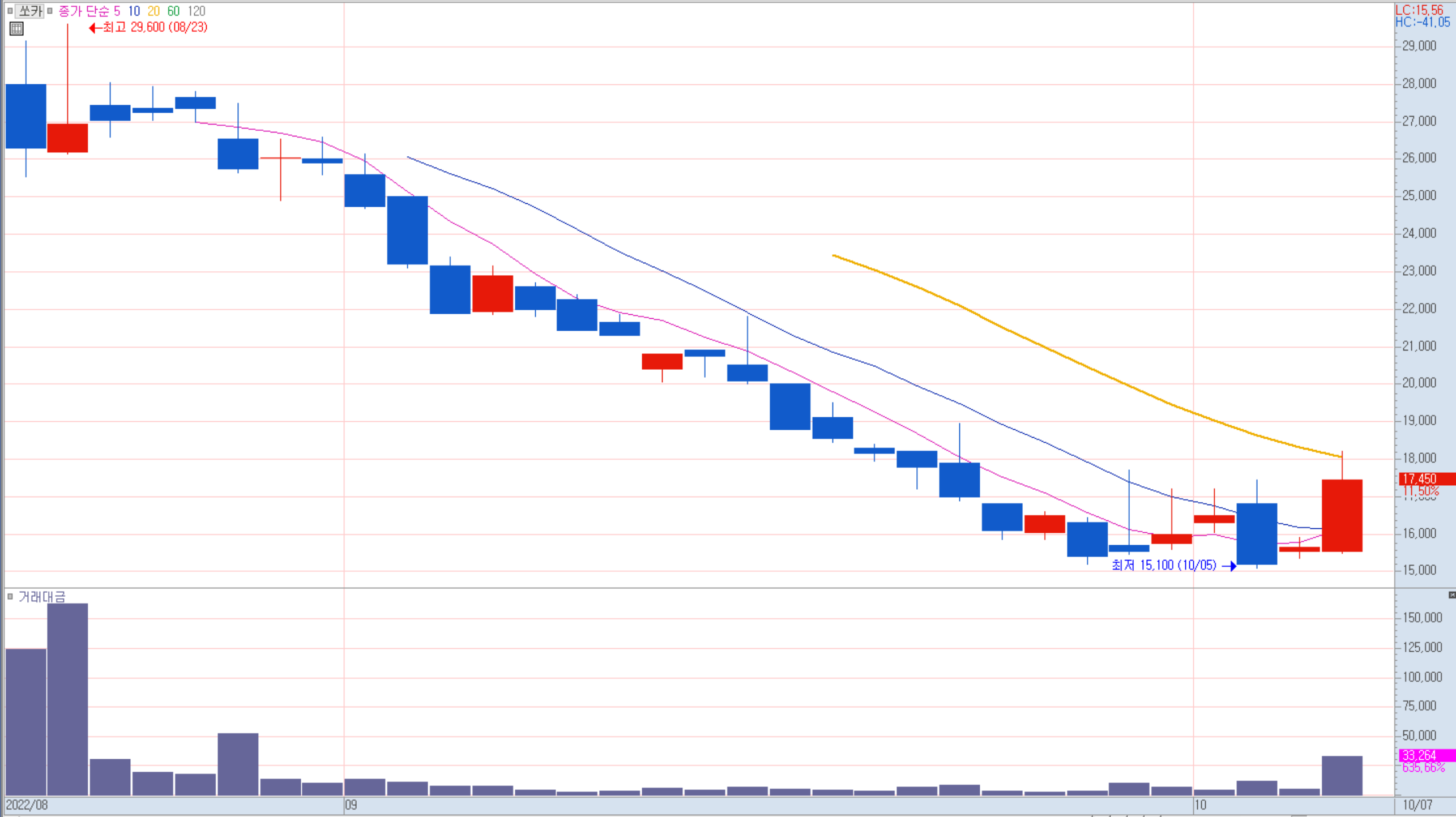 범한퓨얼셀 일봉 차트 쏘카(403550) / +11.50% / 공유차량 /시가총액 5,711억 / 거래대금 332억