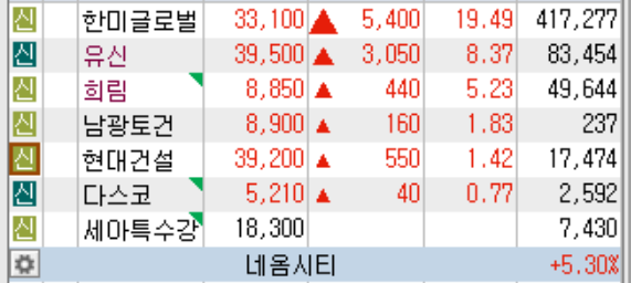 종목 등락률 테마 거래대금(억) 한미글로벌 19.49% 네옴시티 4122 오늘의 특징테마