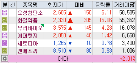 193 양지사 29.78% 문구/슈퍼개미 품절주, 슈퍼개미 매수 이슈로 지속적 상승 1828 에코바이오 25.20% 전기차/바이오연료 美 전기차 등 바이오연료 의무화 확대...전기차도 크래딧 부여 계획↑ 254 이노룰스 20.53% 소프트웨어/신규상장 오늘 코스닥 입성… "글로벌 디지털전환 솔루션 선도" 2053 한미글로벌 19.49% 네옴시티/건설 '한미글로벌'52주 신고가 경신, 하반기 네옴시티 옥석가리기 본격화 전망 4123 화일약품 15.06 대마초 미 대마초 규제 완화 기대감에 관련주 '들썩' 550 엔에스엔 13.13% 자전거, 돼지열병 엔에스엔 "검찰 고발 사실무근, 수익 향상에 주력할 것" 150 소니드 13.01% OLED 삼성 OLED신규 투자 공식화. 8월 사상 최대 매출 달성 323 셀피글로벌 12.92% 전자카드/스마트카드 3분기 영업익 기대감 상승 333 범한퓨얼셀 11.83% 수소/연료전지 23억 규모 자사주 취득 결정 511 쏘카 11.50% 공유차량 전, 현직 경영진 무죄 판결에 상승 330 아스플로 11.34% 반도체 반도체 가스 튜브 국내 최초 국산화 138 파인엠텍 11.00% 분할상장 파인테크닉스, 7일 파인엠텍으로 분할재상장 617 삼성출판사 9.87% 핑크퐁컴퍼니 더핑크퐁컴퍼니가 카카오모빌리티와 블루 RSE 콘텐츠 제휴를 위한 업무 협약(MOU)을 체결 강세 376 넥스턴바이오(089140) / +30.00% / 당뇨 /시가총액 1,047억 / 거래대금 449억